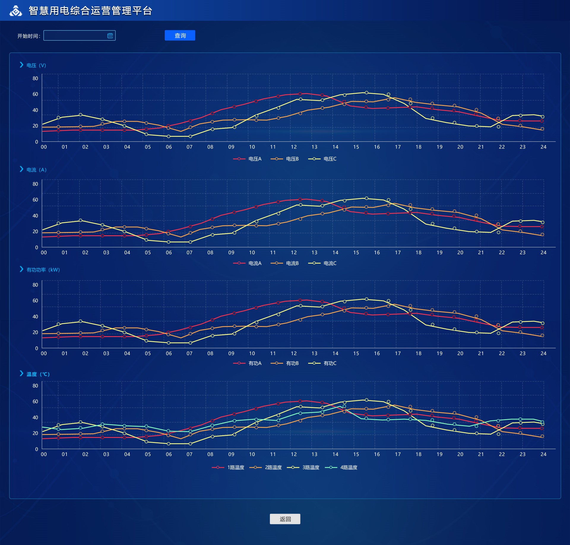 展示設備線路的電流,電壓,功率,溫度走勢圖。