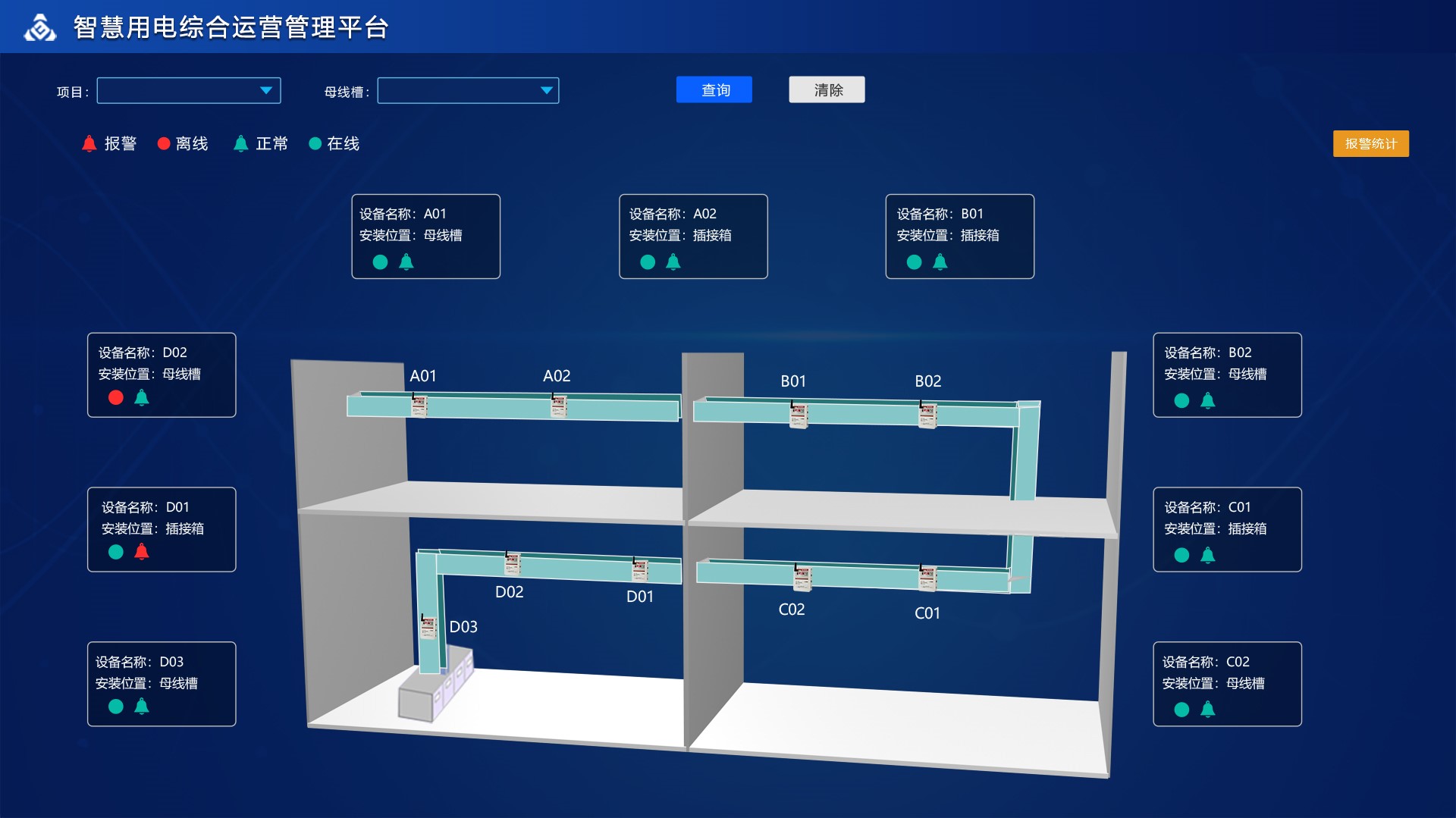 監測母線槽,展示設備實時電氣指標參數以及設備狀態。